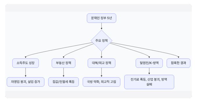 문재인 정부의 소득주도 성장, 부동산, 대북, 외교, 탈원전, k-방역 정책들이 경제 붕괴, 집값 폭등, 국방 약화, 외교 고립, 산업 붕괴, 소상공인 몰락 등 참혹한 결과를 초래했다는 것이 핵심입니다.